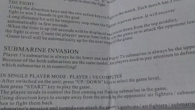 Gameplay: The games range from boring to unplayable. Soccer was one of the most confusing messes I've ever had to endure, Submarine Invasion was the most playable of the lot but stupefyingly monotonous, Street Fighter was just a button-pushing simulator, and Fortress Guardian I could barely even make out, let alone play. The only challenge these games offer is challenging you to figure out what's going on and the only fun you'll have is throwing these across the room after playing them for 30 seconds...