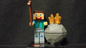 Unfortunately, the creativity given to the figures doesn't carry over to the accessories. The pick-axe he carries is just a regular Lego pick-axe. They didn't even color it silver or light blue to mimic an Iron or Diamond pick-axe. ...Whatever works, I guess.